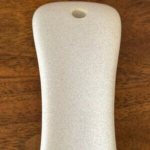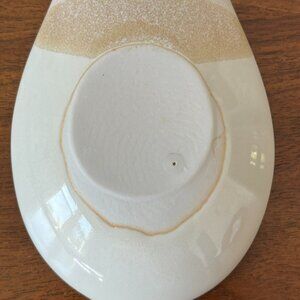 Gorgeous, vintage, unmarked Otagiri spoon rest with a glossy image of a hummingbird feeding on flower nectar. This stoneware spoon rest would have been made in Japan. The spoon rest itself features sandstone, beige and ivory colors. It has a hole at the end for hanging. The spoon rest measures 9" long and 3 1/4" wide at its widest point.