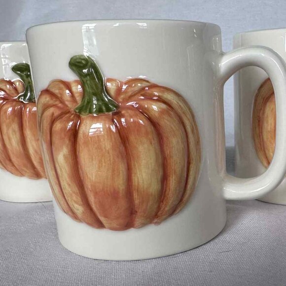 Vintage Otagiri Pumpkin Mug Set of 4 | Raised 3D Fall Coffee Cups | Glossy Ceram