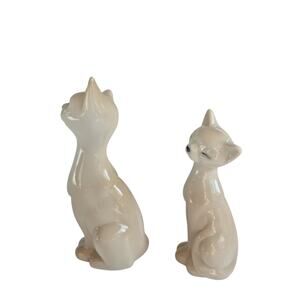 Vintage Otagiri Siamese cat figurines, a pair, circa 1950's, made in Japan. Tan and ivory coloring, excellent condition, no cracks or chips. Approx size: 4 in and 5 in tall, each 2 in wide.