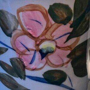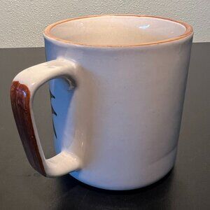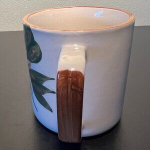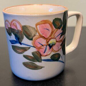 Vintage Otagiri style beige Chinese ceramic mug features a hand painted pink flower blossom and buds with leaves in hues of green and brown. Brown rim and wide accent on flattened rectangular handle. Measures 3.5” tall with a 3” diameter; 4.25” across including handle. Holds 8 fluid oz.