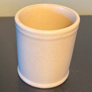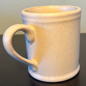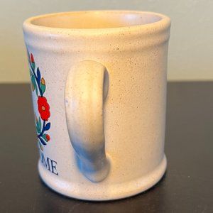 Rustic Oragiri matte finish beige stoneware mug with tiny brown speckles features a floral wreath in burnt orange, muted yellow, green, and blue above blue lettering that reads, WELCOME. Ribbed top and bottom border and handle. Measures 3.75” tall with a 3.25” diameter; 4.75” across including handle. Holds 12 fluid oz.
