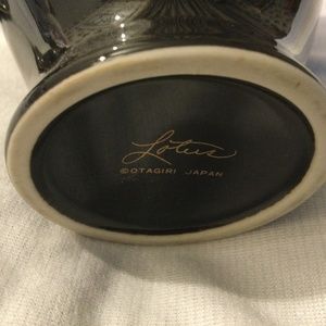 This lovely Otagiri vanity set is based on a shiny black glaze with a gold and pink lotus flower and lily pad design. The ginger jar with top is 6.5" tall and at its widest - 3.5", the base is 2.25" in diameter. The cup is 3 5/8" tall, with a base of 2" and a top diameter of 2.5". The cup has a golden glazed lip on the finely painted and glazed ceramic set.