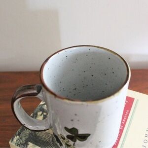 The mug is finished with a glazed interior and exterior, and includes a brown trim along the rim and handle—common features in many Mid-Century Modern ceramic designs.