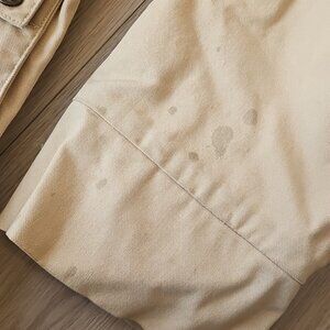 condition: the back of the hood, the left side seems to be bleached or single dyed slightly lighter than the actual color, is not showing up in photos. does have some light grey / black splash staining on the arms (as pictured). no wear otherwise