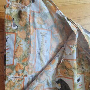 This shower curtain features a unique wildlife design with bears, fish, and birds surrounded by autumn leaves. Printed on durable cotton material, it is suitable for sewing projects or decor.