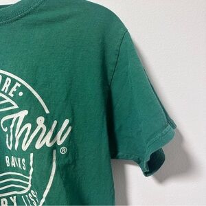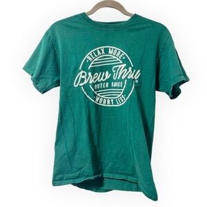 Awesome vintage OBX tee! Dark green crewneck t-shirt with a circular graphic in white ink on the front they says “Relax More / Worry Less” and “Brew Thru Outer Banks” in the center.