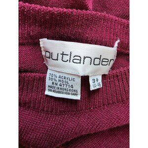This vintage Outlander sweater, made from a wool and acrylic blend, features a rich burgundy hue and stylish button detailing on the shoulder. Its classic design offers comfort and warmth, making it a versatile choice for cooler seasons.