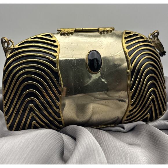 Vintage Oval Bag Golden Black Brass Onyx Stone Small Strap Black Nylon 4*7. Condition is Pre-owned. Shipped with USPS Ground Advantage.