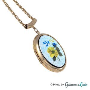 Vintage Oval Blue & Yellow Floral Gold Tone Photo Locket Pendant Necklace