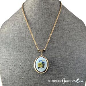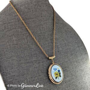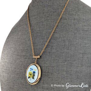 Vintage gold tone locket pendant necklace featuring yellow and blue floral artwork on a white oval piece.