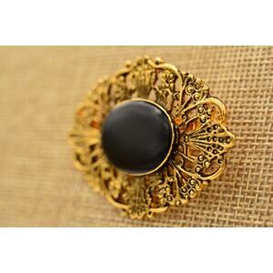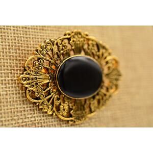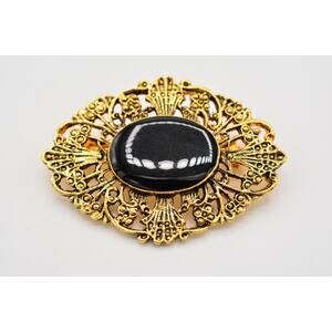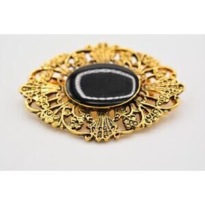 Vintage Oval Brooch Pin Black Enamel Center Filigree Antiqued Gold 1990s BinAH