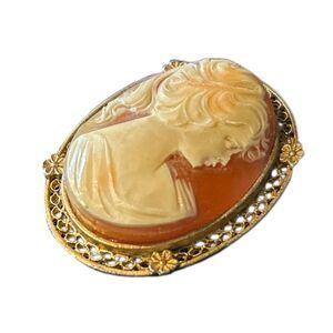 This vintage oval cameo brooch or pendant features a beautifully detailed depiction of a woman with a ponytail, elegantly framed with gold metal trim. The intricate craftsmanship highlights the delicate features of the cameo, making it a timeless piece that exudes vintage charm. Versatile in design, it can be worn as a brooch on clothing or as a pendant on a chain, allowing for various styling options. Perfect for collectors or anyone looking to add a touch of classic elegance to their accessory collection, this piece is sure to be a conversation starter and a cherished addition to your jewelry box. Size: 1.5" x 2"