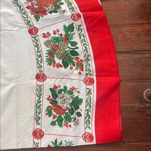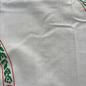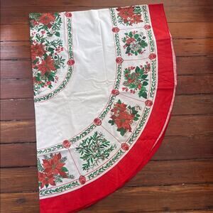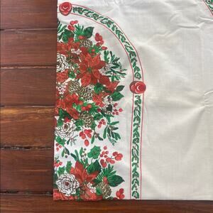 Vintage Oval Christmas Holiday Poinsettia floral print tablecloth; has a yellow glass stain; SEE PICS