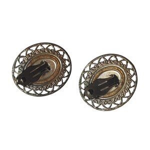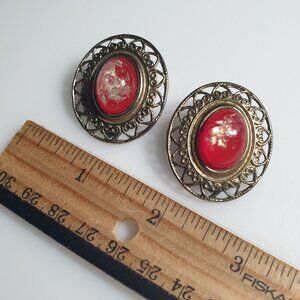 Vintage Oval Clip On Earrings Red Gold Filigree Metal Setting Retro Costume Gift