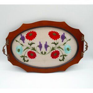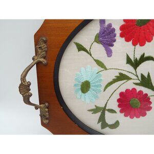 Vintage Oval Glass and Wood Embroidered Floral Serving Vanity Tray Brass Handles