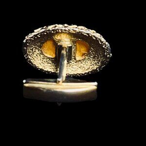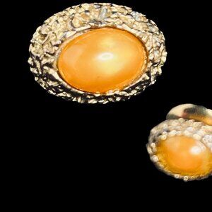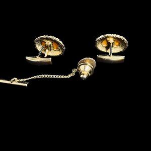 Vintage Oval Gold Tone With Orange Cabochon Cufflinks And Tie Tack Set.