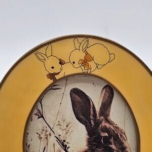 Whimsical Oval Rabbit Decor Picture Frame - Easter & Nursery Accent 3x4 Photo. Frame is 4.76w x 5.75h and ready for 3x4 photo.