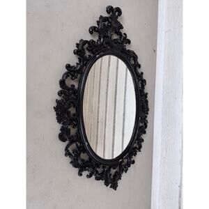 This elegant oval wall mirror features a lightweight, ornate scroll border with a chippy, shabby chic finish, adding a vintage touch to any space. Currently painted black, it can be displayed as-is for a bold statement or repainted to fit your decor style.