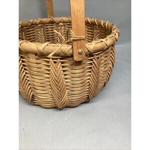 Vintage Oval Woven Basket With Handle - 13x11.5x7”. In good condition. The handle folds down to the side of the basket. The handle measures 11.5”Lx7”H