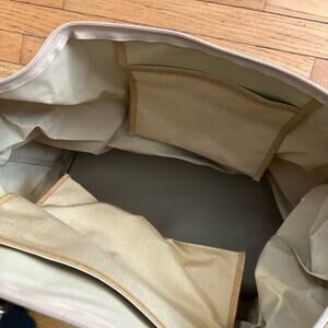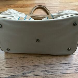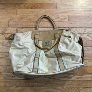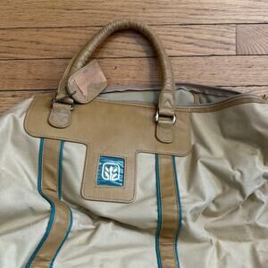 It has a tan and green color combination and solid pattern. Measuring at 18"x14.25"x10", this suitcase is the perfect size for carry on. It is lightweight for easy transport. The soft case is made of faux leather and is expandable to fit all your travel essentials. This unisex adult bag features a duffle tote design and is great for short trips. This is preowned and has some signs of wear.