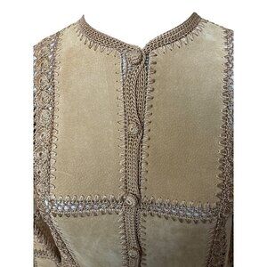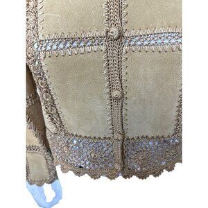 Chic Overland patchwork cropped jacket in tan. Constructed of suede rectangles connected by matching crocheted design. Perfect for women size 8.