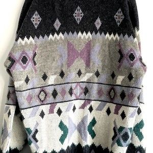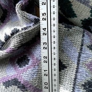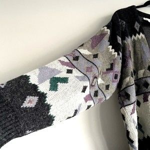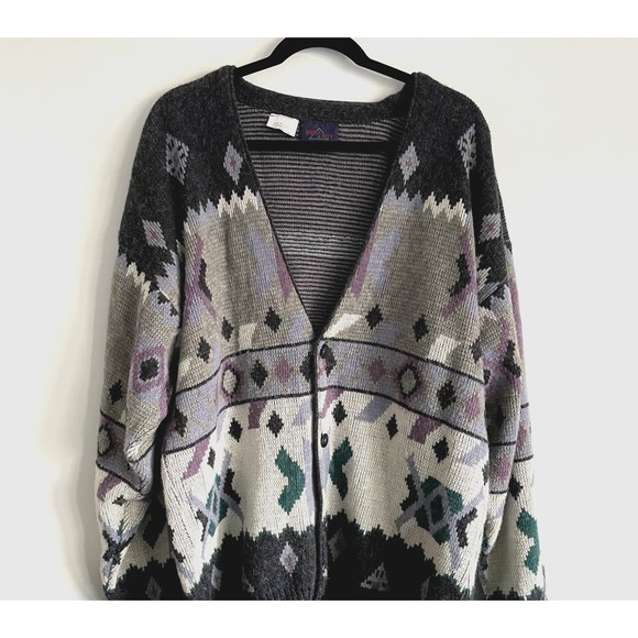 Details - beautiful wool blend button-up cartigan with eye-catching print - dropped shoulders for a slouchy, cozy vibe - ribbed cuffs and hem and v-neck - oversized fit, a trendy vintage piece - longlined, over the bum so is perfect over a pair of leggings - beautiful textured buttons going down the front