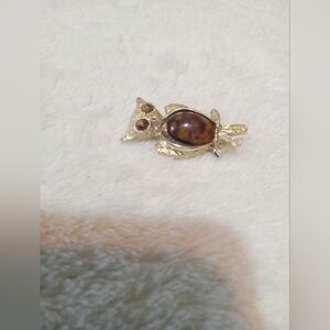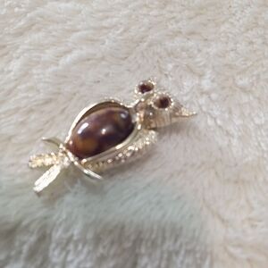 This vintage owl/bird brooch/pin features a gold-toned design with a brown marbled cabochon jelly belly-like in an oval shape. Measuring 1 3/8 inches in length and 3/4 inches at the widest point, this mid-century modern piece is a unique and eye-catching accessory suitable for various occasions such as Mother's Day, Christmas, anniversaries, birthdays, or any special event. The brooch showcases intricate details such as embossed feathering, adding a touch of charm and fun to any outfit. This adorable owl brooch would be an awesome gift for your owl brooch/pin collector, that bird watching friend or family member OR to add to your own collection of adorable brooches.