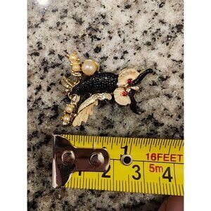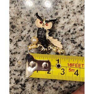 Vintage Owl Brooch Pin With Black Enamel, Pearl Accents and Red Crystal Eyes