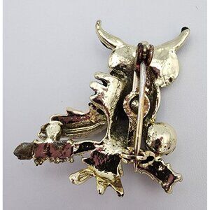 This charming vintage owl brooch features intricate detailing and faux pearls. The red gem eyes add a striking touch, making it an eye-catching accessory.