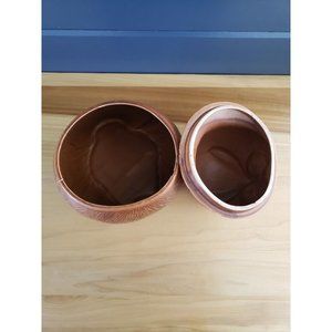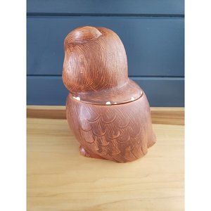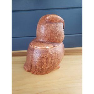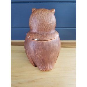 This fun cookie jar is in overall good condition with some chips where the lid meets the bottom that could be repainted to match and made less noticeable. Also a small crack on his right side as shown.