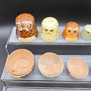 This vintage 5 pieces wooden hand painted owl family nesting dolls are pre-owned and has been very gently used showing little to no wear. It is a set of 5 Owls in different colors.