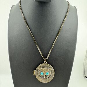 Discover the enchanting world of this vintage owl locket necklace, a captivating piece that blends rustic charm with a touch of magic. The intricate owl design & shimmering turquoise eyes create a truly unique & eye-catching piece. Perfect for adding a touch of bohemian flair & cottagecore elegance to your outfit.