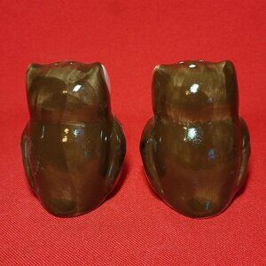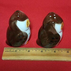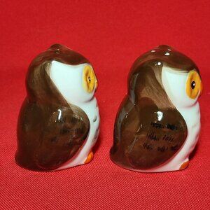 Two shakers, each shaped like an owl with a brown, white, and orange color scheme. They are made of ceramic and have hand-painted details.