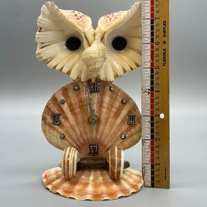 Vintage Owl Shell Art Clock Handmade Kitsch Souvenir 1970s
