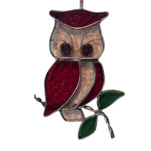 Vintage Owl Stained Glass Sun Catchers Red Silver Green 8"x5" Home Decor