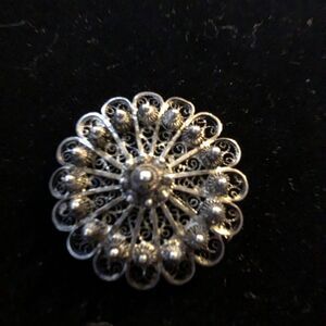 Vintage Oxidized Silver 925 Filigree Blooming Flower Dotted Round Pin Brooch