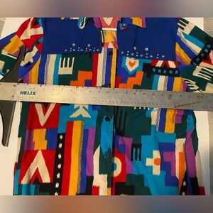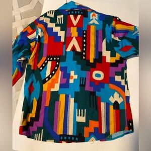 This vintage, hard to find cotton shirt from Ozark Mountain runs pretty true to size. Its Aztec design is very eye-catching. Try it with a solid blue wild rag for a great look!