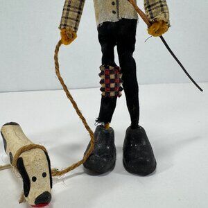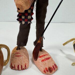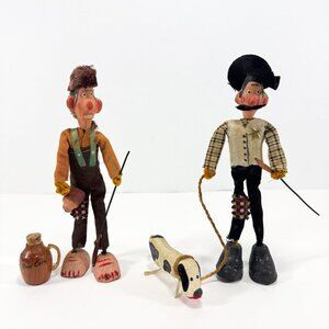 Up for your consideration is a pair of vintage Ozark souvenir folk dolls. These dolls feature hand-painted faces, cloth outfits, wire legs and arms. The hands are made of pipe cleaners. There are also pipe cleaners for the dogs feet.