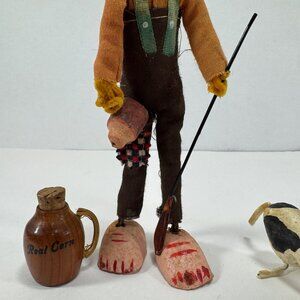One doll depicts a hillbilly with suspenders, coonskin cap, with jug.