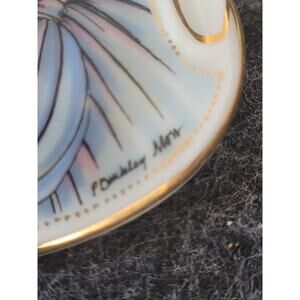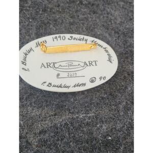 This oval brooch has a very sweet painted scene on the front of a mother and daughter gazing at a swaddled newborn baby boy cradled in the mother’s arms. The colors are pastel blues, pinks, and purples with shiny gold accents around the outside. The back is marked, ‘P. Buckley Moss 1990 Society Membership’ and ‘Anna Perenna Art’. The gold toned pin is secure but looks like it has been glued on. Measures 2 1/2 inches long