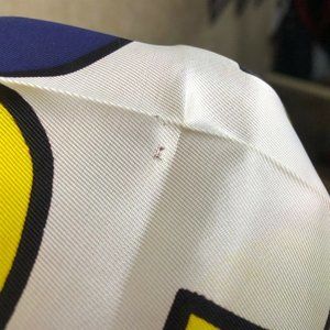 vintage scarf from P St Hilaire Paris ...approx 14" x 54"...large graphic pattern in yellow and blue....not tag may be silk or polyester....does have one small hole ...see all picture