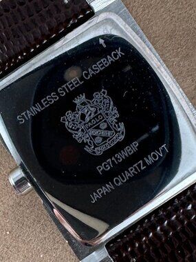 Vintage PAOLO GUCCI Designed Modern Chronograph Watch. Man's Watch with Date, Day an 24 Hour Sub Dials, 9 inch Brown Leather Strap, signed on back PG713WBIP, Exciting Sculptured shape, Crystal Hour Markers, Silver hands and Accents, Mother of Pearl dial. Silver Tone stainless steel Back, Japan movement, new battery, pre owned Case is 1.625 inches with Lugs x 1.375 inches wide PG Logo on Case and Buckle almost new