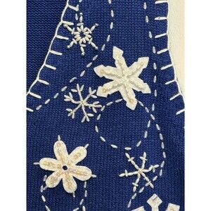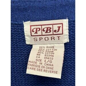 This Vintage PBJ Sport Ugly Christmas Sweater is a cozy and festive addition to your wardrobe. The blue knitted vest features a solid pattern with tight-knit details, perfect for the winter season. The V-neckline adds a stylish touch, making it suitable for various occasions such as travel, parties, casual wear, or even workwear. Made from a blend of ramie and cotton, this vest is adorned with crochet, jewel, glitter, button, beaded, rhinestone, embroidered, and sequin accents for a whimsical and colorful look. Perfect for those who appreciate retro and 80s/90s styles with a hint of Christmas cheer.