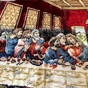 This is a beautiful vintage P&C Italian tapestry depicting The Last Supper from the 1970s.