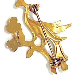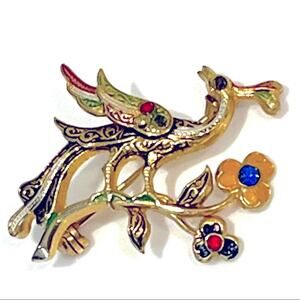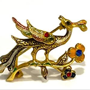 Vintage PEACOCK BIRD BROOCH 1.5" Gold Pheasant Pin Rhinestone Flowers Branch