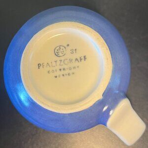Pfaltzgraff Villa Flora pattern featuring ribbed detailing and hand painted wraparound design of blue leaf shapes against an off-white background. Beautiful deep blue interior and upper and lower exterior. Comfortable, off-white, flattened handle. Measures 4” tall with a 3.25” diameter; 5” across including handle. Holds 12 fluid oz. Made and hand painted in Mexico.