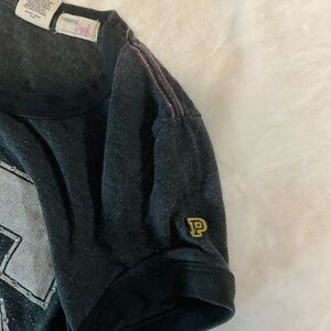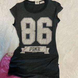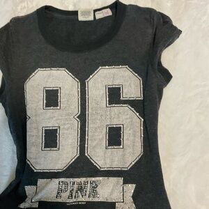 Experience ultimate comfort with this PINK Victoria's Secret pajama set, featuring a dark grey top from their vintage collection and unique logo top with a bold '86' print and vibrant pink pants adorned with the iconic 'PINK' branding. Perfect for lounging or a restful night's sleep, this set combines casual style with a touch of athletic flair.