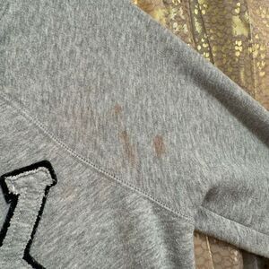 Good used condition for the most part but it does have a stain I was unable to get out on the right shoulder, see photo 4. If you're really good with stain removal this could be for you! Really cute sweater otherwise. Heather gray color with sewn/patched on front logo, logo has light piling in the black area from age/washes. A bit oversized.