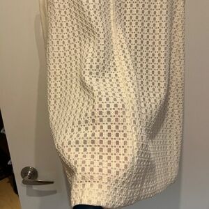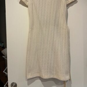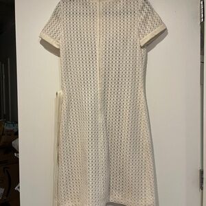 Cream midmod shift dress with geometric texture, belt at waist and button detail at neck. Likely from the 1960s or 1970s--purchased from a vintage market in 2017. Includes a slip that probably isn't original, but can be replaced easily. Fits like a modern size 2.