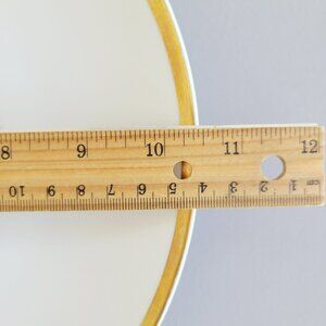 Plate is in overall good condition. There are scratches from use (see photo) and wear on gold trim (see photo).